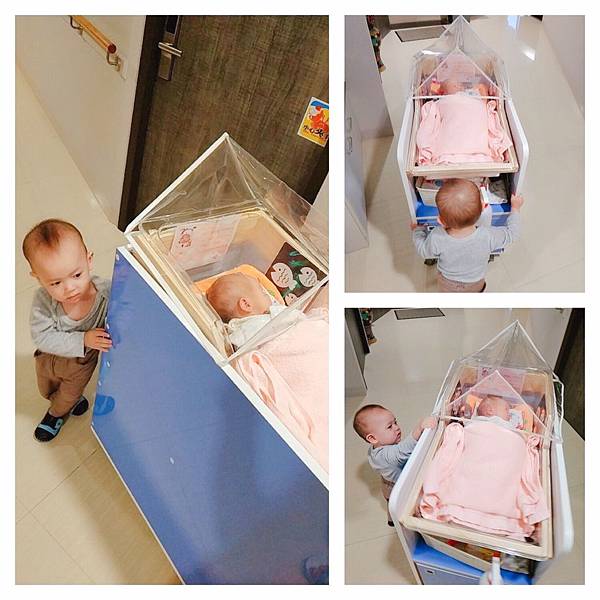 而另一種則是要一次推出來12個小時,後面再推回去,其實二寶媽可以上手,但對新手媽來說剛生完又要顧12小時是很精神緊繃的,所以我第二胎說甚麼月子中心也要找母嬰親善的,而品御優就做得超好!你可以隨時推寶寶進房間親餵,累了也可以隨時推寶寶回嬰兒室,這沿路會用如照片的保護罩套著,避免寶寶吹到風也可以避免細菌,而且下方有個籃子會幫你備好一堆小手帕、濕紙巾、尿布以及酒精消毒液,這些全是品御優提供的喔!都包含在一天的托嬰費裡了,左右兩邊也會放黑白圖卡刺激感官發展。