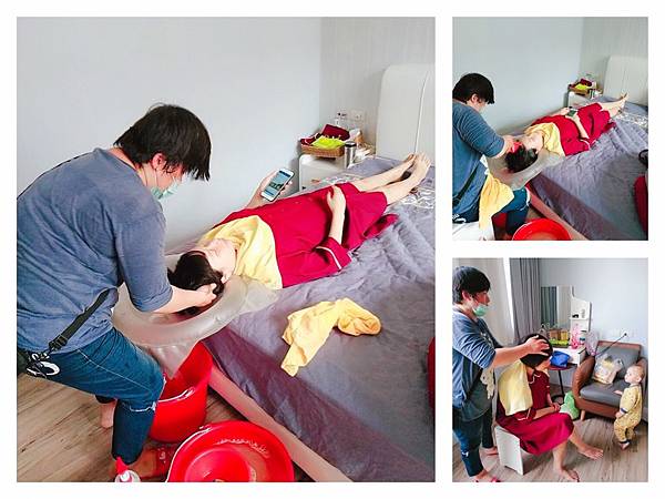 某天下樓要推嬰兒上來的時候,我聽到另一個產婦跟櫃台說他想要出去洗頭,我在想他應該跟我一樣是剖腹,因為剖腹媽要兩個禮拜才能真正好好洗一次澡,不然只能用擦澡的方式來避開傷口,結果櫃台護理師說他們也有幫忙預約到房間薑汁洗頭的,我這個一天沒洗就變油田的頭皮,馬上轉身詢問可否代訂,結果阿姨就大包小包地來敲門了哈哈哈哈!