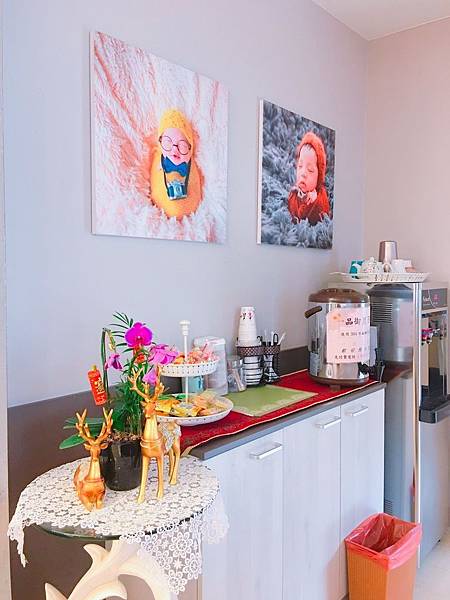 因為是母嬰親善,能常常把寶寶推回房間親餵的關係,月子中心把關很嚴格,要上樓時先審核一關,上樓一律只能先到大廳,進來要先去洗手跟量體溫,再去會客室等媽媽,或者也可以先去嬰兒室前看寶寶,這裡還提供一個點心吧,有咖啡、茶、餅乾,跟一桶桂圓紅棗茶,雖然進不去媽媽房間,但對來探望媽媽小孩的親友們也很貼心對待呀!有得吃也有得聊 XD